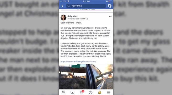 The man’s plan was to use his firearm to shoot the car window, thereby breaking it enough for them to pull the unconscious man to safety. Kelly told the man not to fire, that it would be far too dangerous to do so. She then pointed to the Stealth Angel Survival Kit in her hands and pulled out the glass-breaking tool.